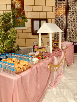-Διακόσμηση τραπέζιων μας με γάζες στα χρώματα του στολισμού σας, βάσεις και τα απαραίτητα στάντ για τα γλυκα, πιατελες, πυρεξ με καπακι για τα αλμυρα ειδη, χωρος για τις μπομπονιερες σας, εαν ζητηθει.